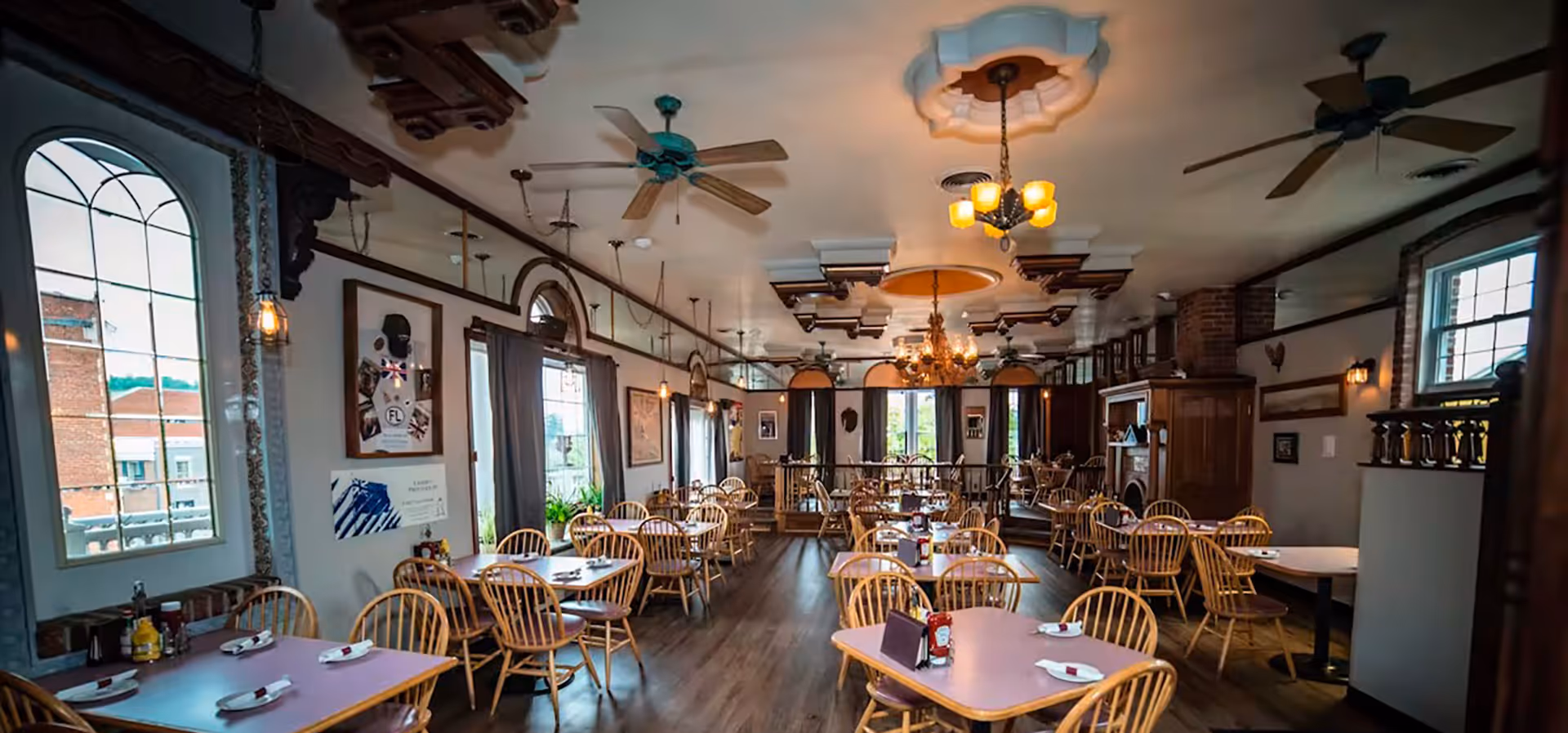 The Main Dining Room showcases a warm fireplace, an elegant chandelier, and offers an array of architectural elements, creating an ideal setting for your next dining experience. It displays a map of Westmoreland County from 1857, along with various other historical items from the area, illustrating the evolution of the Pittsburgh region over time.